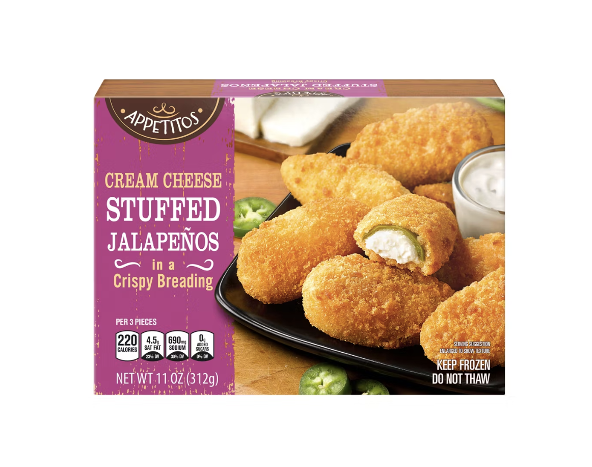 Appetitos Cream Cheese Stuffed Jalapenos are spicy and smooth. The jalapeno pepper holds a creamy cheese center. These come frozen and warm up to a good balance of heat and richness. They are fun eaten straight or with a dipping sauce. The crispy outside adds texture that is hard to resist. They are a lively appetizer that grabs attention. Many people return for more because they have just enough kick. These jalapenos pair nicely with cooling ranch style sauce. They bring contrast to milder snacks on the table. This helps keep flavors interesting throughout the night.
