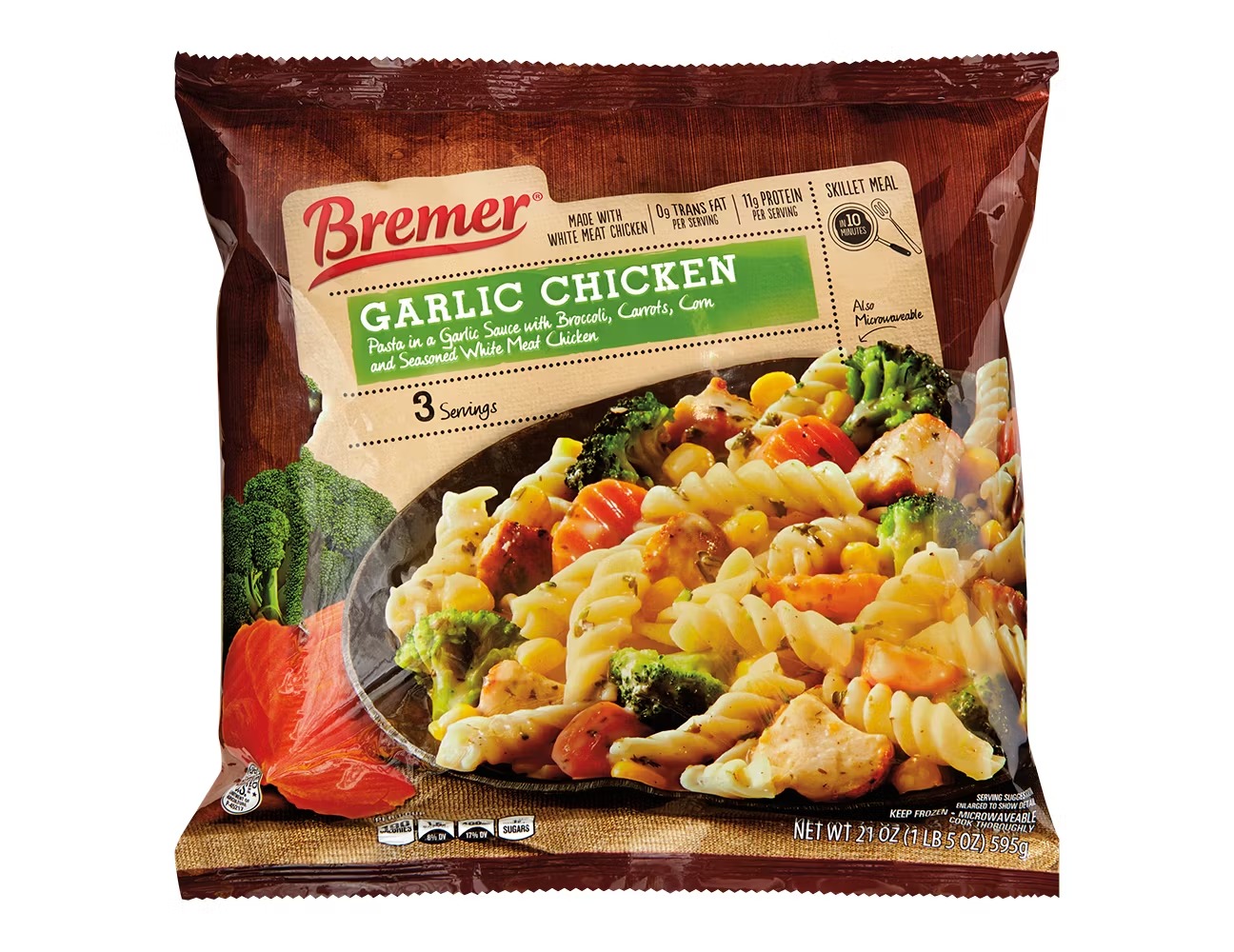 This skillet meal is made with grilled white meat chicken, pasta, and a creamy garlic sauce that feels comforting without being heavy. The chicken comes pre-cooked, so everything heats evenly in just a few minutes on the stovetop or microwave. You also get broccoli and red peppers mixed in, which adds color and a little crunch. The garlic flavor leans savory rather than overpowering, making it easy to pair with a side salad or a slice of toast. It works well as a solo meal, but plenty of people stretch it into two servings by adding extra veggies or leftover rice.