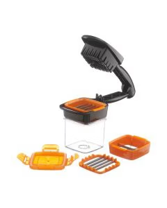 - Handheld food chopper with interchangeable stainless steel blades for slicing, dicing, or wedging fruits and veggies; features a transparent catch container for mess-free prep, safety lock, and dishwasher-safe, BPA-free design—praised for speeding up meal prep compared to traditional processors, suitable for all ages and health-focused cooking.