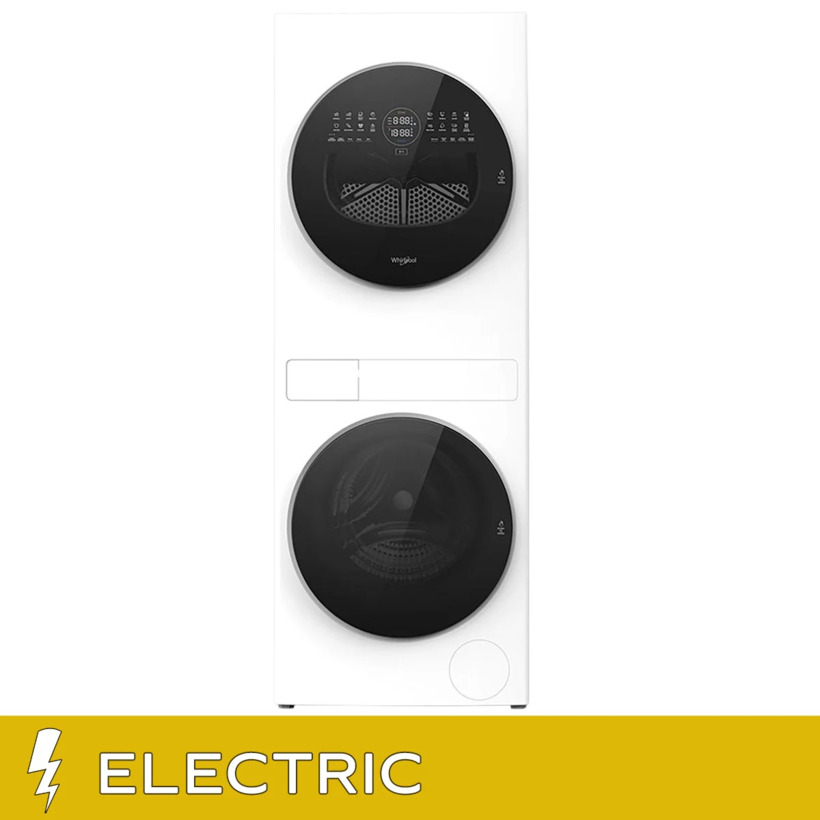 This Whirlpool compact laundry tower stacks a washer and dryer in one vertical unit to save floor space. It works well in apartments or smaller homes where square footage is limited. The controls are placed in the center for easy reach without bending too low. Despite the compact design, it still handles everyday laundry needs. It is a smart solution for homes that need full laundry capability in a tighter layout.