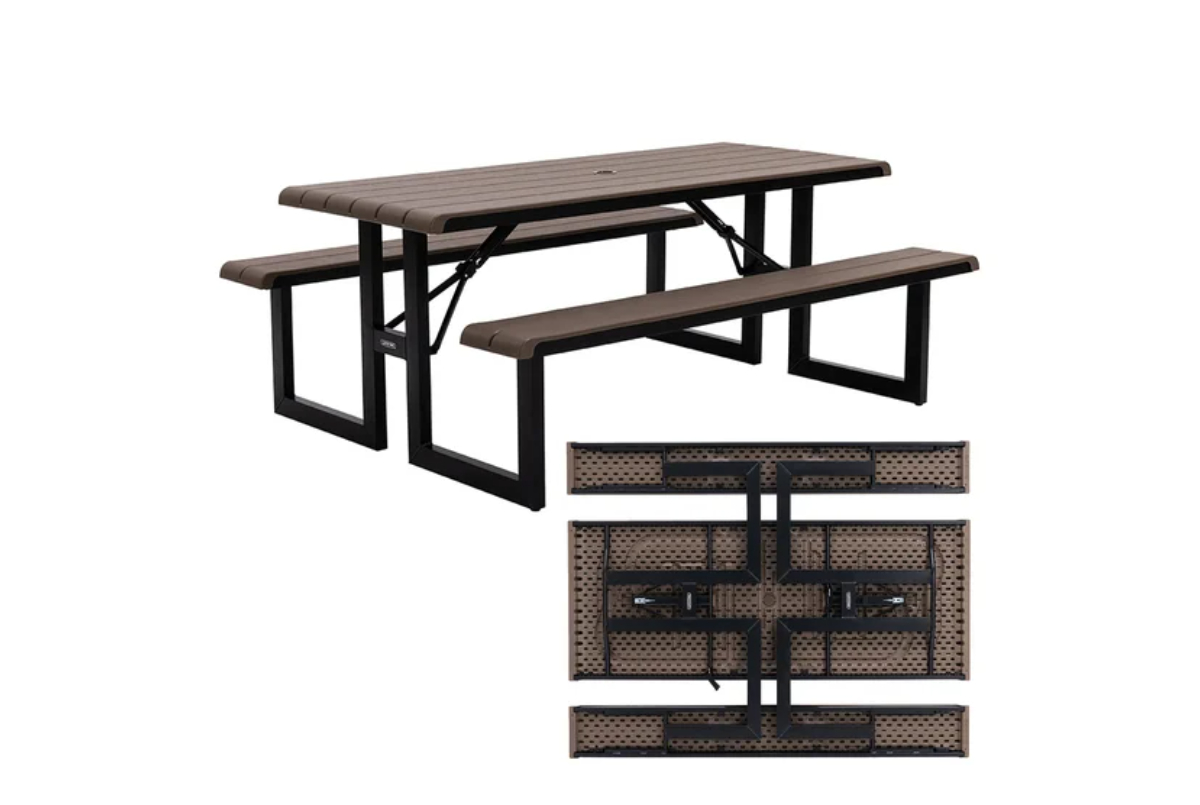 Description: A 6-foot folding picnic table with an umbrella hole.