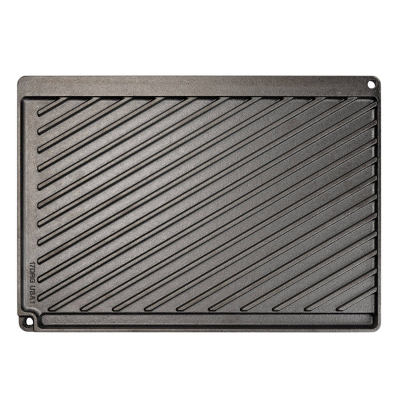 Description: A heavy-duty 17×12 inch dual-sided pan; one side is a flat griddle and the other is a ridged grill.