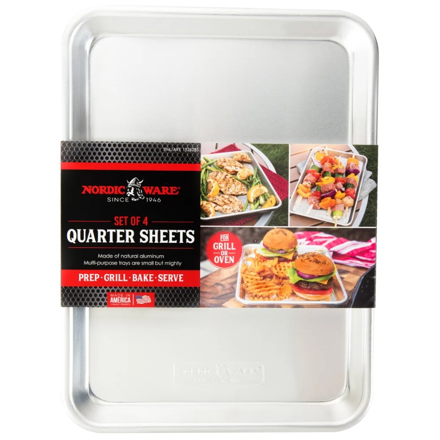Description: A set of four small aluminum baking sheets perfect for small batches or toaster ovens.