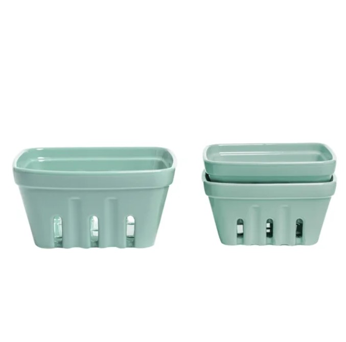 Description: Ceramic organizing baskets available in teal or white ($3 off until April 12th).
