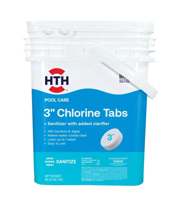 Large bucket of high-quality chlorine tablets for pool maintenance.