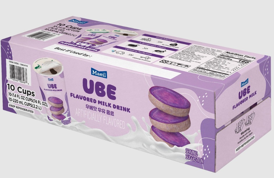 Description: A specialty dairy beverage flavored with purple yam (ube). The 10-pack of individual cups is made with whole milk and served chilled.