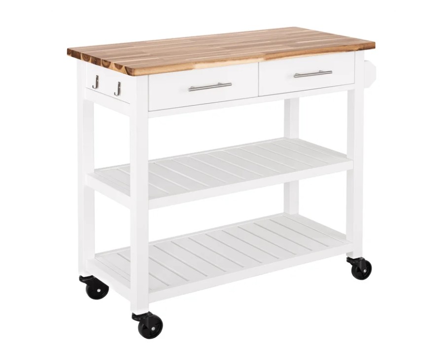 Description: A mobile kitchen island solution featuring a solid acacia wood butcher-block top, two utility drawers, two lower storage shelves, and integrated towel hooks.