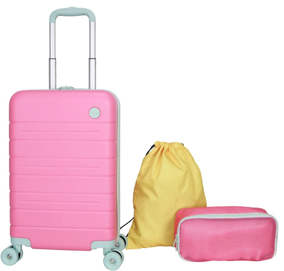 Description: A coordinated luggage set designed for children, featuring a hardside carry-on suitcase, a matching backpack, and a specialized shoe or laundry bag.