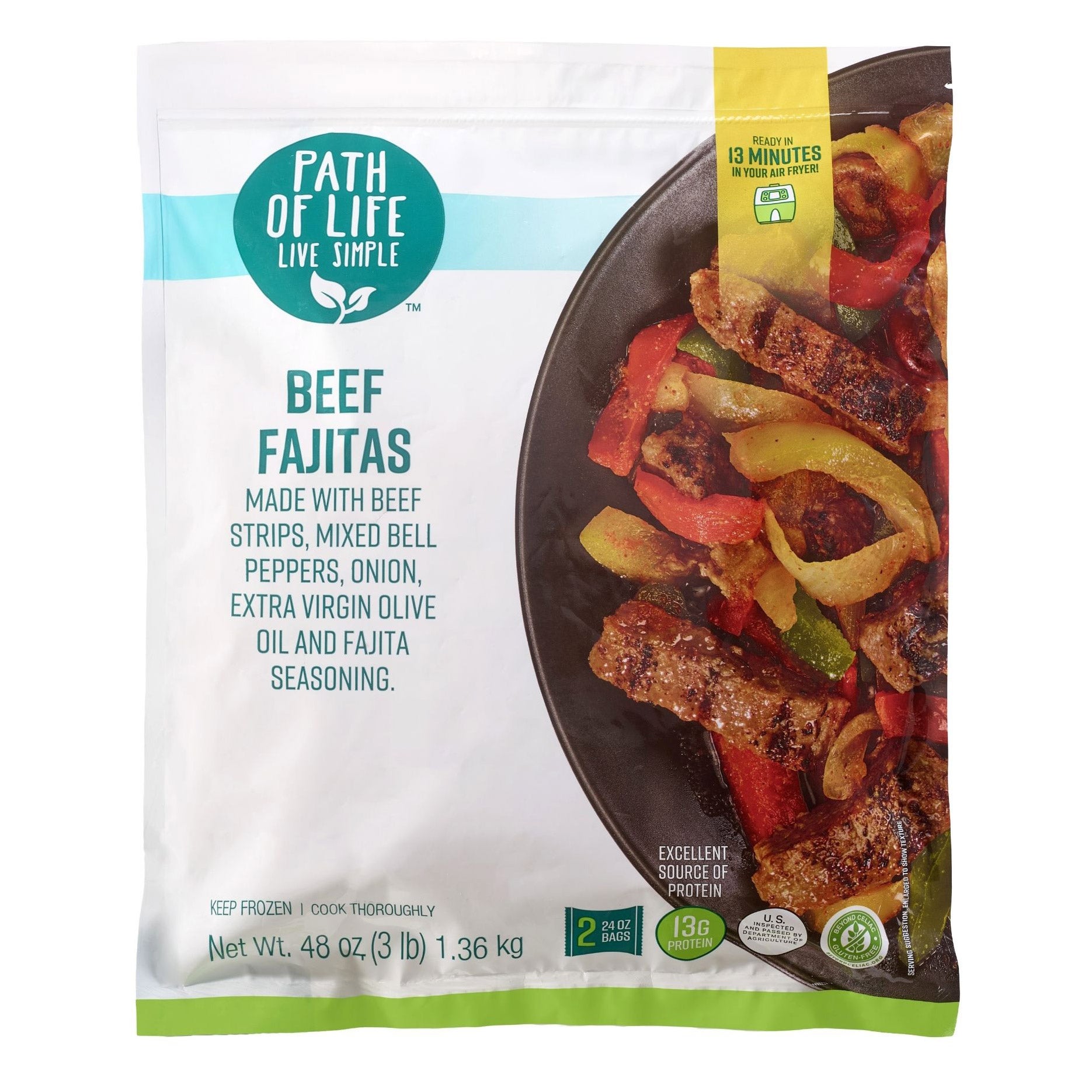 Grass-fed beef strips with bell peppers and onions cooked in extra virgin olive oil and fajita seasoning, packed as two 24-oz bags for fast skillet or air fryer meals.