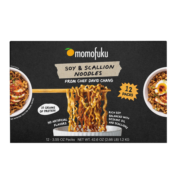 Twelve-pack of individual noodle servings with rich soy sauce, sesame oil, and scallions, delivering bold flavor with no artificial ingredients.