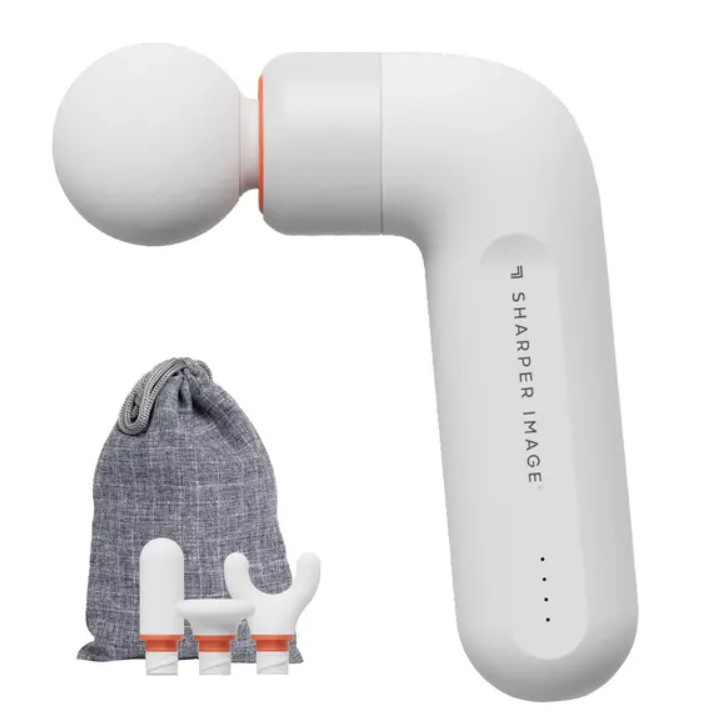 A compact, travel-ready percussion massager with four speeds, four targeted heads, and a 2-hour run time.