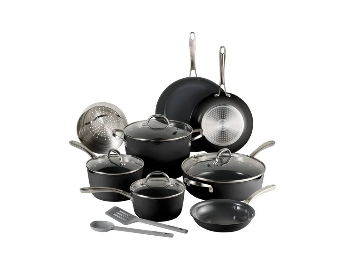 A complete kitchen set featuring ceramic coating, which is a safer nonstick alternative. Includes pots, pans, lids, and utensils.