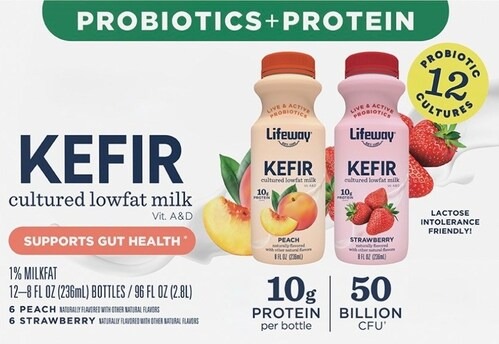 - A 12-count variety pack including strawberry and peach kefir bottles, packed with probiotics, perfect for busy mornings, available in San Diego region locations (California, Arizona, Colorado, New Mexico).