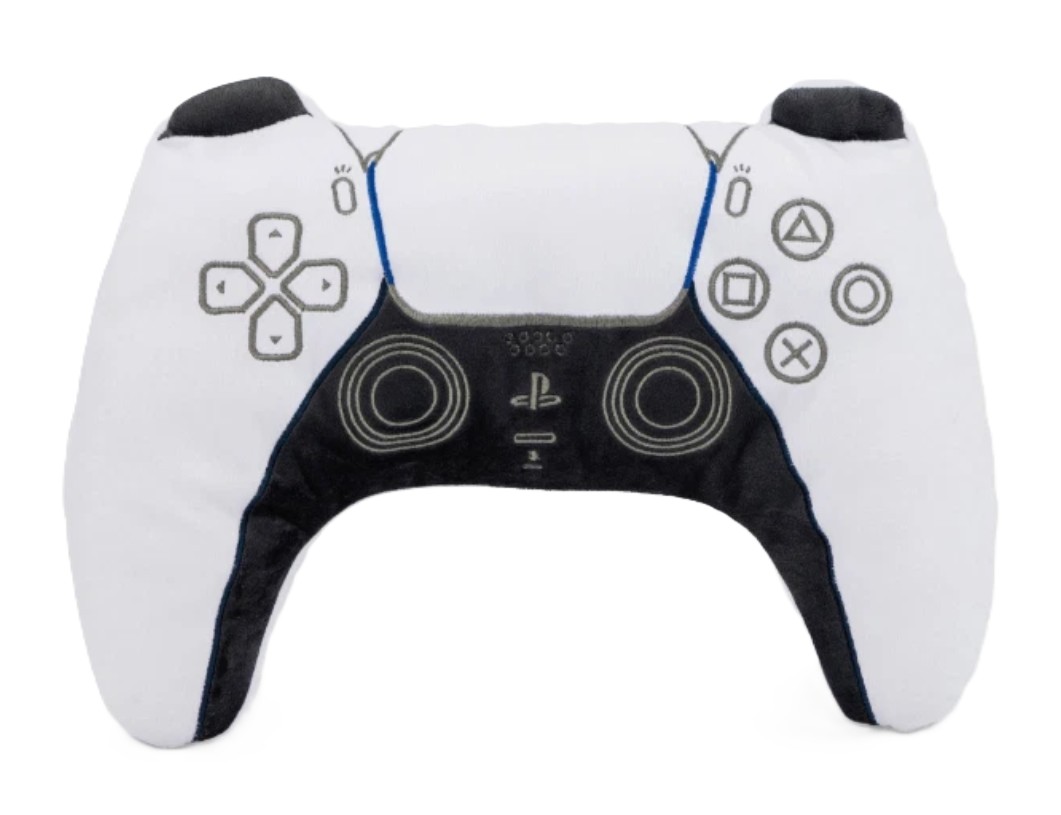 Soft, stuffed pillows shaped like iconic PlayStation controllers, complete with trademarked logos.