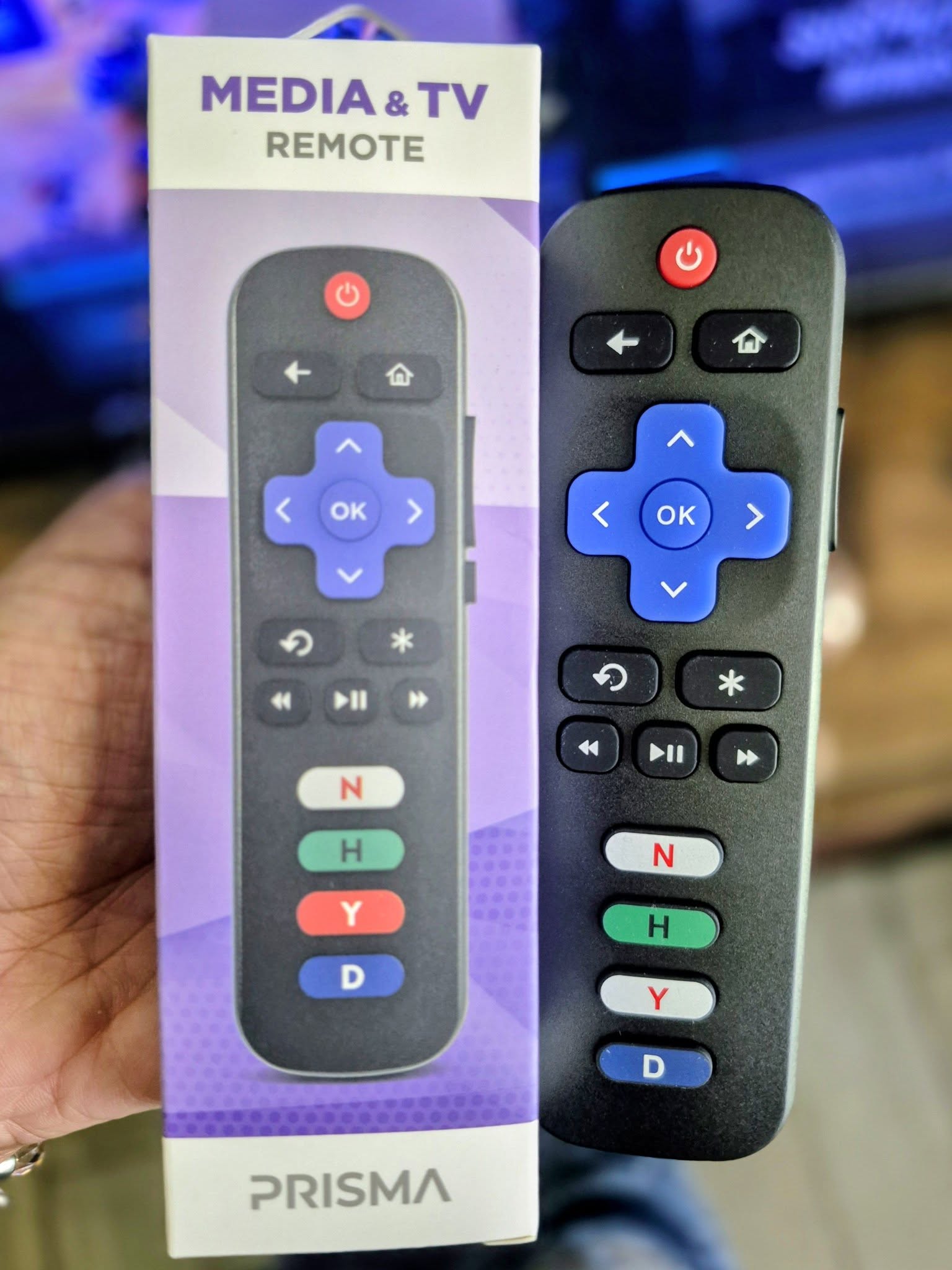 A universal remote pre-programmed for Roku devices, featuring a standard button layout.