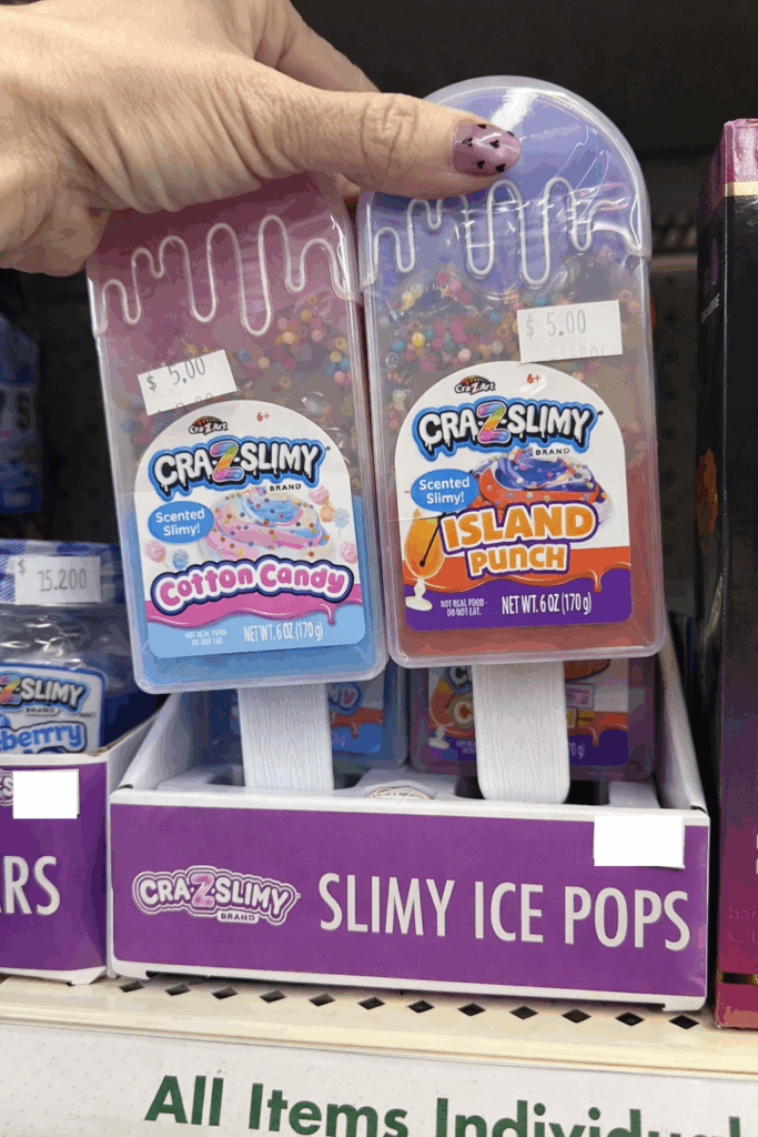 Designed to look like popsicles, these slime containers are as fun to display as they are to use. Each one includes scented slime with colorful bead mix-ins for extra texture. The ice-pop packaging makes them perfect for party favors, Easter baskets, or summer-themed gifts. They’re mess-contained, visually playful, and a standout sensory toy find at Dollar Tree.