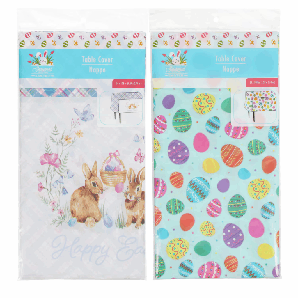 Dollar Tree’s latest Easter table décor features playful designs with eggs, bunnies, florals, and pastel patterns. The lightweight plastic table covers protect surfaces during meals or craft time, while the themed placemats help tie the table together. These are especially great for kids’ tables, classrooms, or casual holiday hosting—cute, practical, and disposable without feeling flimsy.