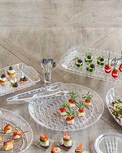 High-quality ceramic dinnerware with distinct patterns, often used to create a coordinated and organized look on open kitchen shelving.