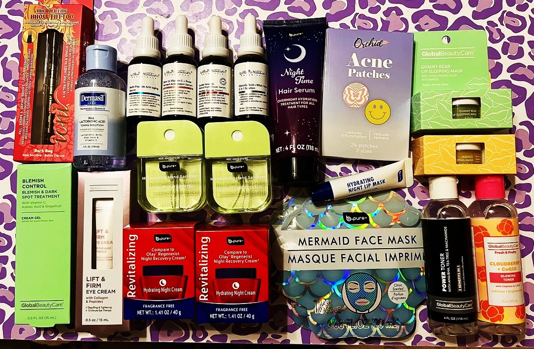 Includes makeup wipes, body lotions, eye serums, brow lamination kits, and foot bath fizzers. Several closely resemble products that retail for $10–$30 at big-box and drugstores.