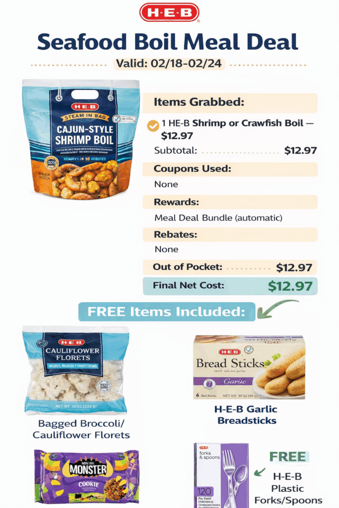 Seafood Boil Meal Deal: * Buy: H-E-B Shrimp or Crawfish Boil ($12.97).
