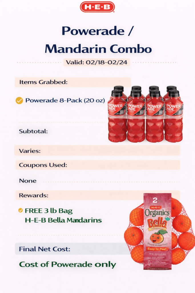 Buy Powerade 8-pack (20 oz) and get a 3 lb bag of H-E-B Bella Mandarins FREE.