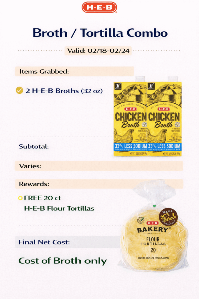 Buy 2 H-E-B Broths (32 oz) and get a 20 ct pack of H-E-B Flour Tortillas FREE.