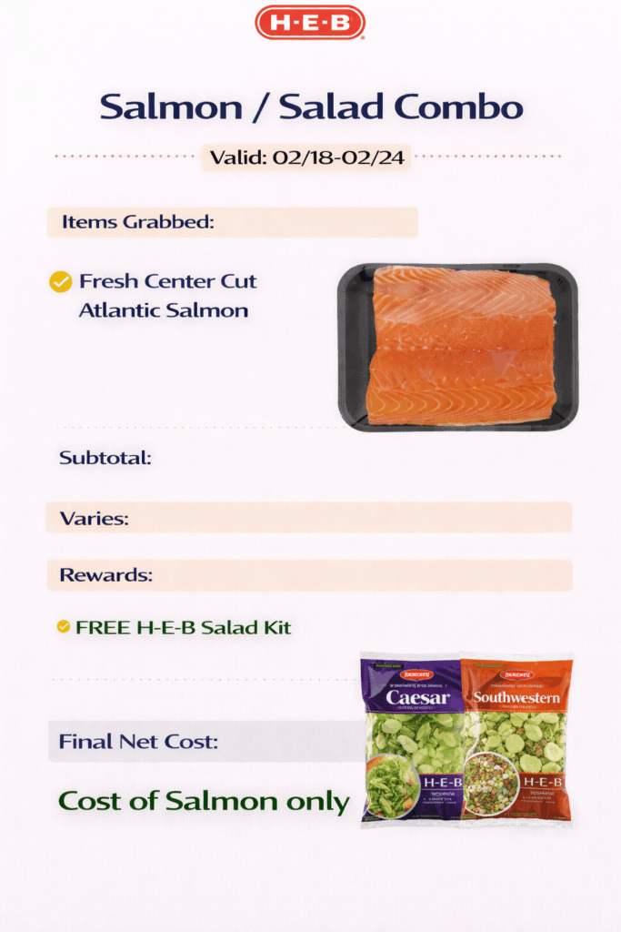 Buy Fresh Center Cut Atlantic Salmon and get an H-E-B Salad Kit FREE.