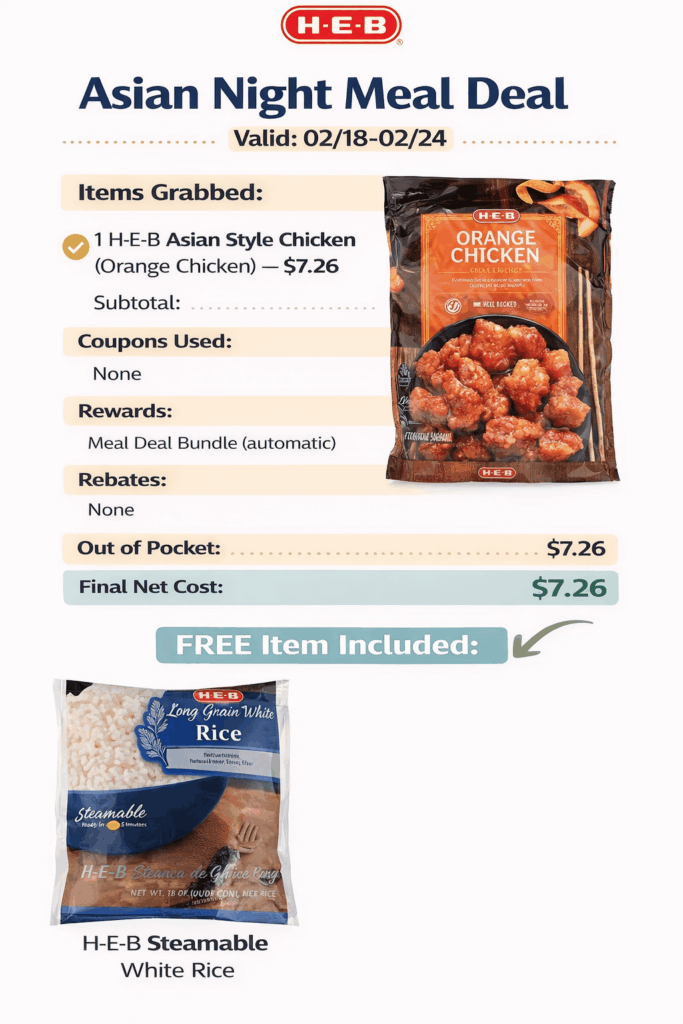 Asian Night Meal Deal: * Buy: H-E-B Asian Style Chicken (Orange Chicken) ($7.26).