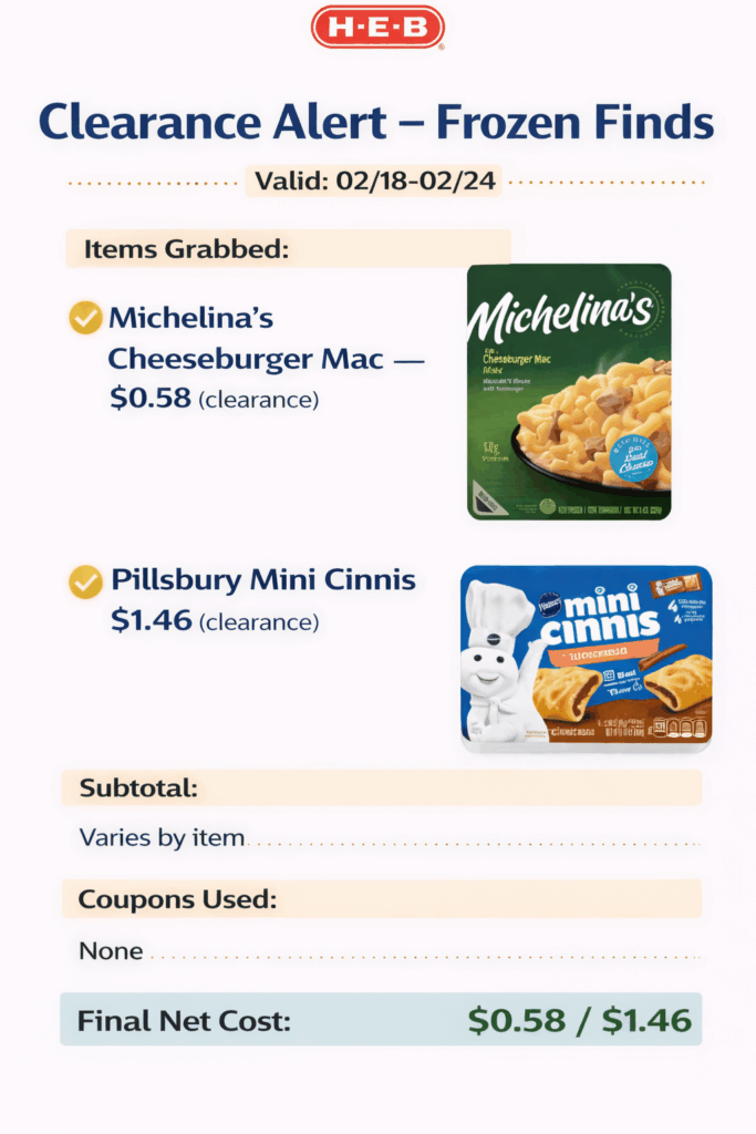 Clearance Alert: Check the frozen section for “Michelina’s Cheeseburger Mac” (marked down to $0.58) and “Pillsbury Mini Cinnis” ($1.46).