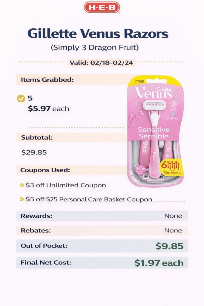 Use: $3 off Unlimited Coupon + $5 off $25 Personal Care Basket Coupon.