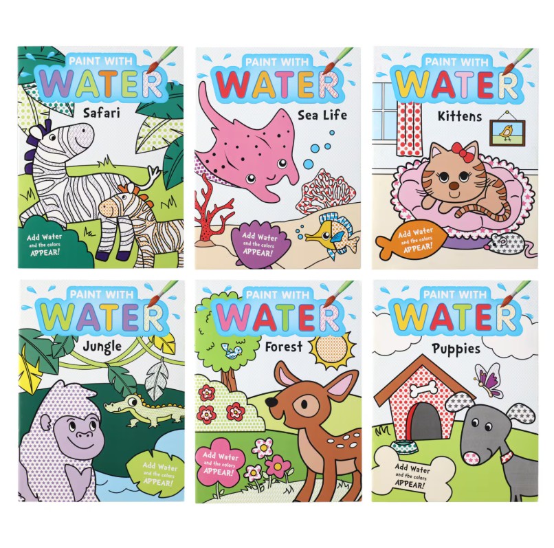 Mess-free painting books using water only with licensed characters.