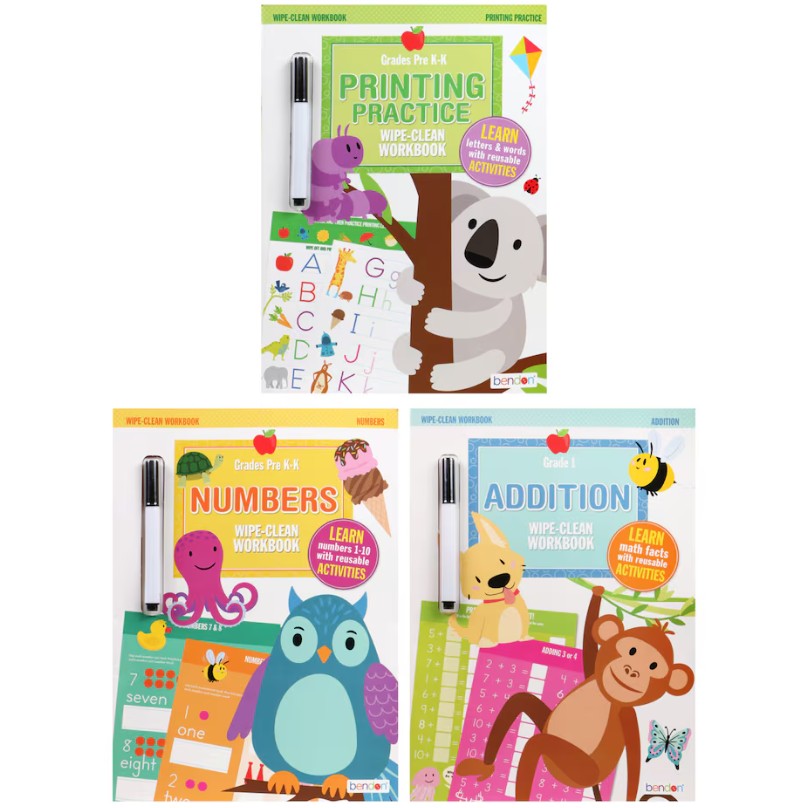 Reusable dry-erase books covering numbers, grammar, and pen control.