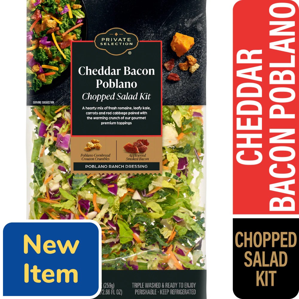 Elevate your salad game with six new Private Selection Salad Kits, including Cheddar Truffle, Blueberry, Cheddar Bacon Poblano, Sweet Onion Gruyere, Cherry Bacon Cheddar, and Asian Sesame Ginger. Each kit combines fresh greens, toppings, and dressings for restaurant-quality flavor at home.