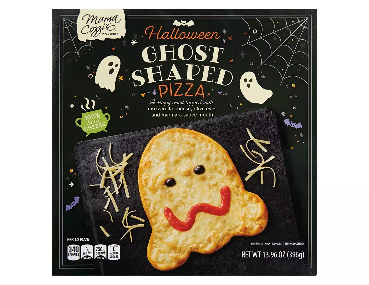 This ghost-shaped pizza from Mama Cozzi’s Pizza Kitchen is pure Halloween fun. It’s shaped like a friendly ghost, complete with olive eyes and a cheesy smile made from mozzarella and marinara. The pizza bakes up quickly and has that classic, comforting flavor everyone loves. It’s perfect for themed dinners, kids’ parties, or cozy nights when you want something festive without cooking from scratch. Since it’s a limited-time item, it’s worth picking up while it’s still haunting the freezer aisle.