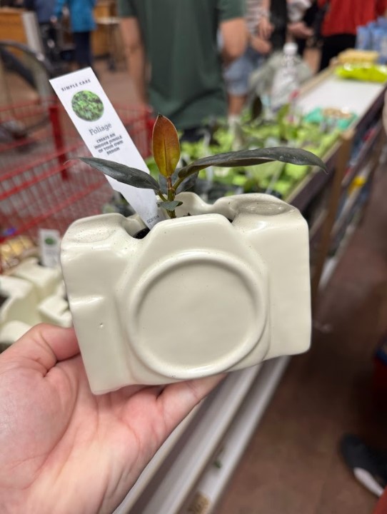 Live plants, soil, moss, decorative container.