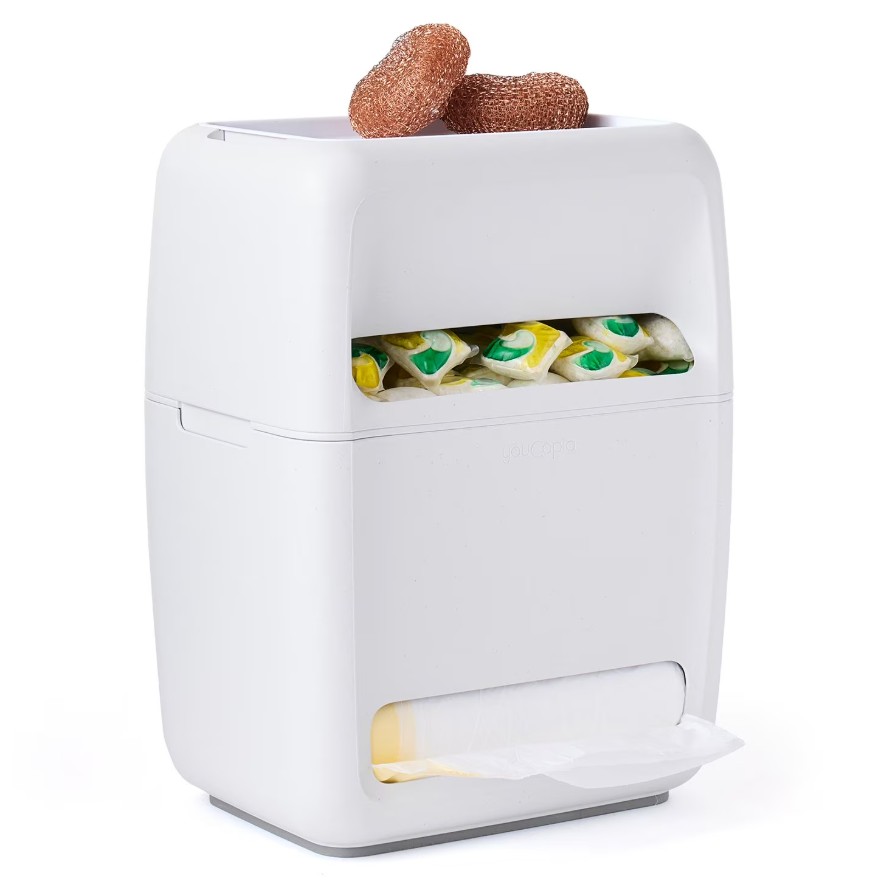 Description: A versatile storage gadget designed for laundry rooms or under kitchen cabinets. It can hold a full roll of club-sized trash bags or up to 100 laundry/dishwasher pods and features a built-in storage shelf on top.
