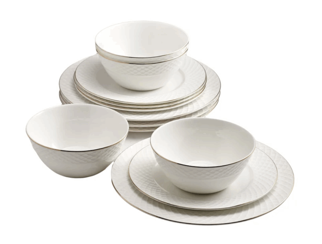 This Mikasa Trellis Gold dinnerware set brings an elegant touch of retro style to your dining table. Made from fine bone china, each piece features a delicate gold pattern that adds sophistication to any meal. The 12-piece set includes dinner plates, salad plates, and bowls, perfect for family meals or special occasions. Its timeless design complements both casual and formal dining settings. Whether you are hosting a dinner party or enjoying a quiet meal, this set elevates your dining experience with classic charm.