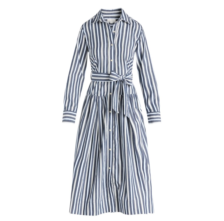 This crisp cotton dress features contrast stitching and a full elastic back for comfort. It mimics high-end “slow fashion” brands that focus on construction and material.