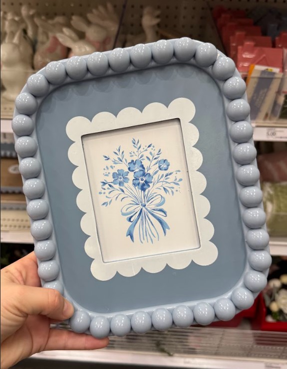 This blue beaded frame features a scalloped inner edge and charming detail. It’s a sweet way to display seasonal prints or family photos. The soft pastel tone fits beautifully into spring décor themes.