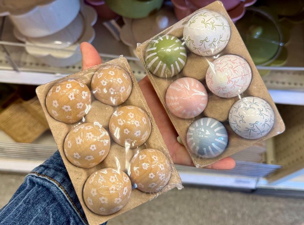 These wooden decorative eggs are simple, sweet, and perfect for DIY lovers. Available in soft spring hues and neutral floral patterns, they work beautifully in bowls, tiered trays, and Easter tablescapes. The lightweight wood makes them easy to display or customize with paint and ribbon if you want to personalize your décor. They add a rustic charm that blends seamlessly with farmhouse and cottage aesthetics. Whether you scatter them around your home or use them for crafting with kids, they’re an easy, affordable seasonal accent.