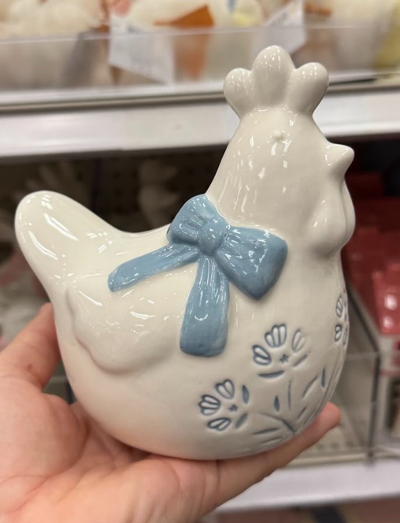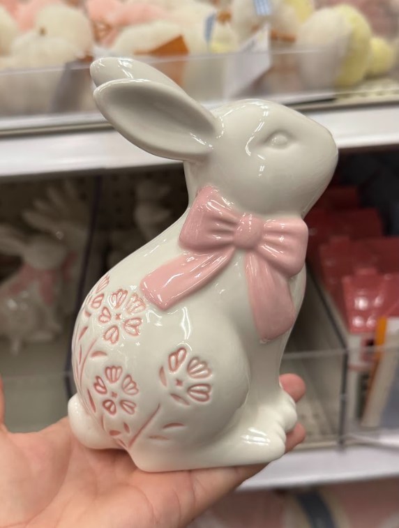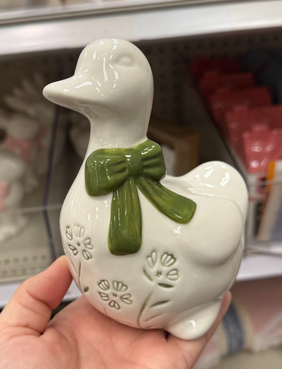 This glossy ceramic duck features delicate floral embossing and a soft-colored bow for a classic spring look. It’s sturdy, polished, and surprisingly high-end for Dollar Spot pricing. The subtle detailing makes it easy to style with neutral or pastel décor. Display it on a shelf, console table, or Easter centerpiece for an instant seasonal touch. It pairs beautifully with the matching chicken and bunny figurines for a coordinated display that feels curated and cohesive.
