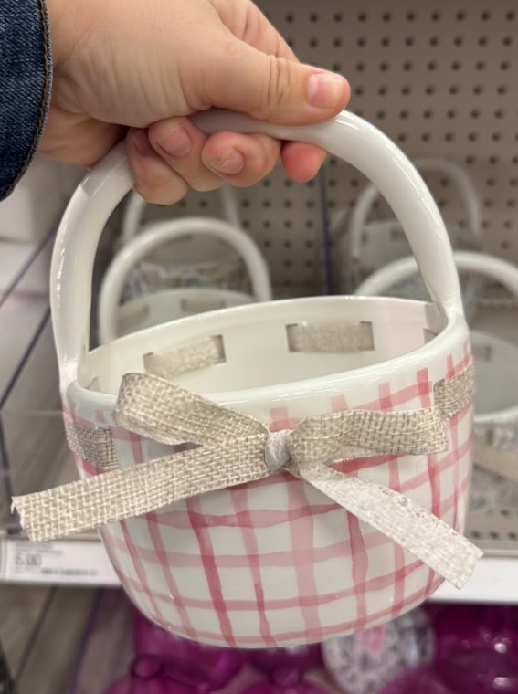 This ceramic basket features a soft pink gingham pattern and burlap bow detail. It’s sturdy, glossy, and perfect for holding decorative eggs or candy. The farmhouse charm makes it a standout piece for tabletops or shelves. It’s functional enough to use but decorative enough to display all season.