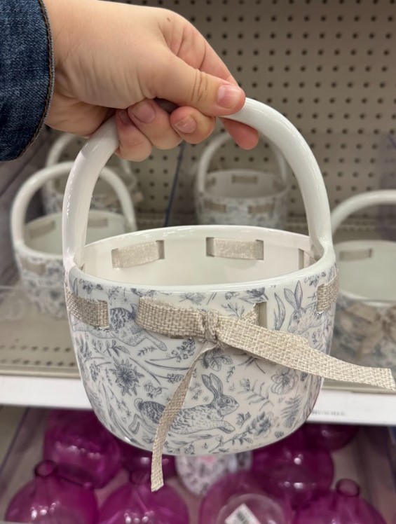 This neutral toile-patterned basket feels classic and refined. The detailed bunny illustrations add a vintage touch, while the burlap bow keeps it farmhouse-friendly. It’s perfect for tabletop styling or filling with decorative eggs.