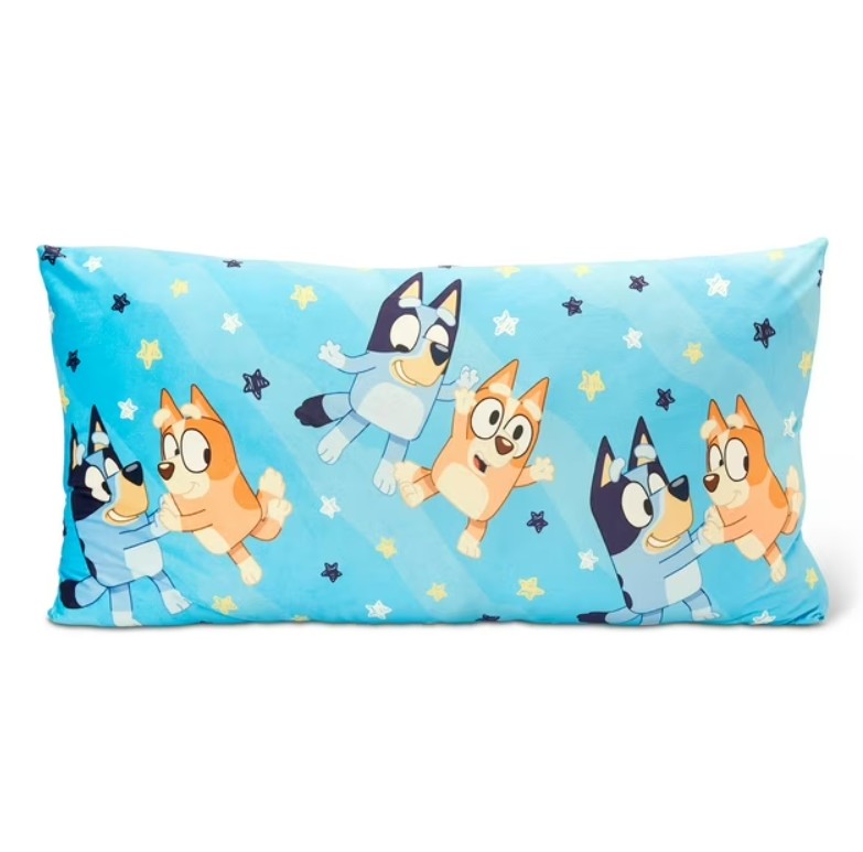 Large 18″ x 36″ pillows featuring Bluey, Jurassic World, and Hello Kitty.