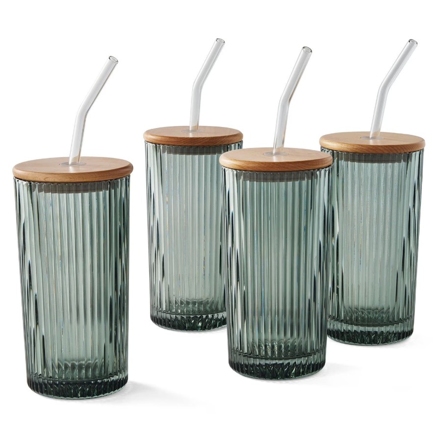 A 4-pack of 18oz glass tumblers with bamboo/plastic lids and glass straws.