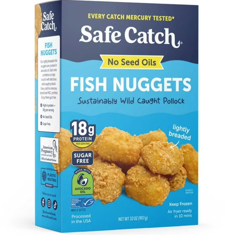 Sustainably wild-caught Pollock nuggets that are mercury tested and lightly breaded.