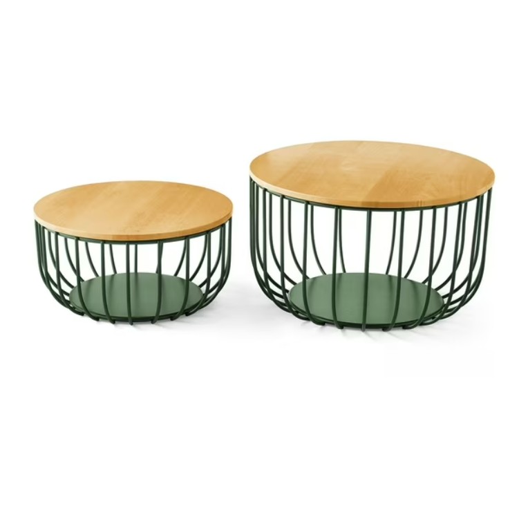 A set of two handcrafted wrought iron baskets with wooden tops for organization.