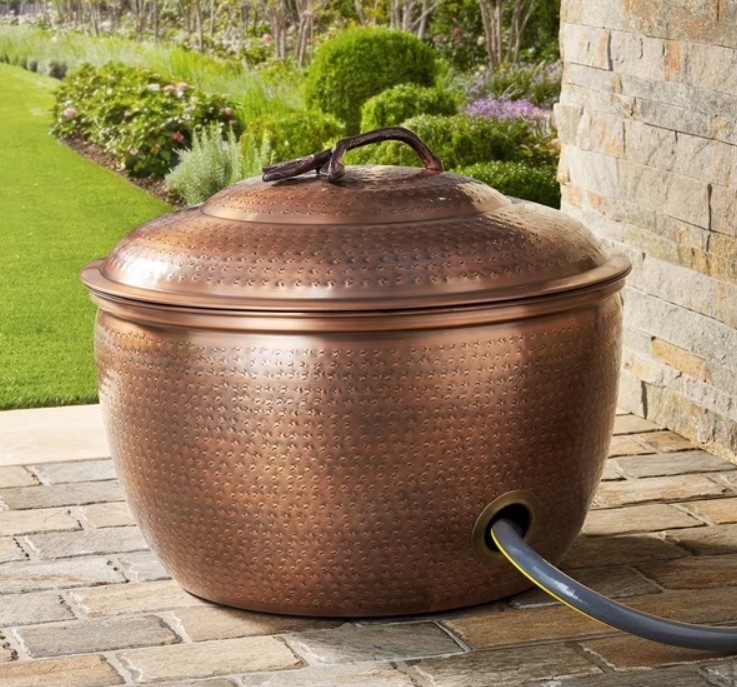 Antique copper finish that holds up to 110 feet of hose.