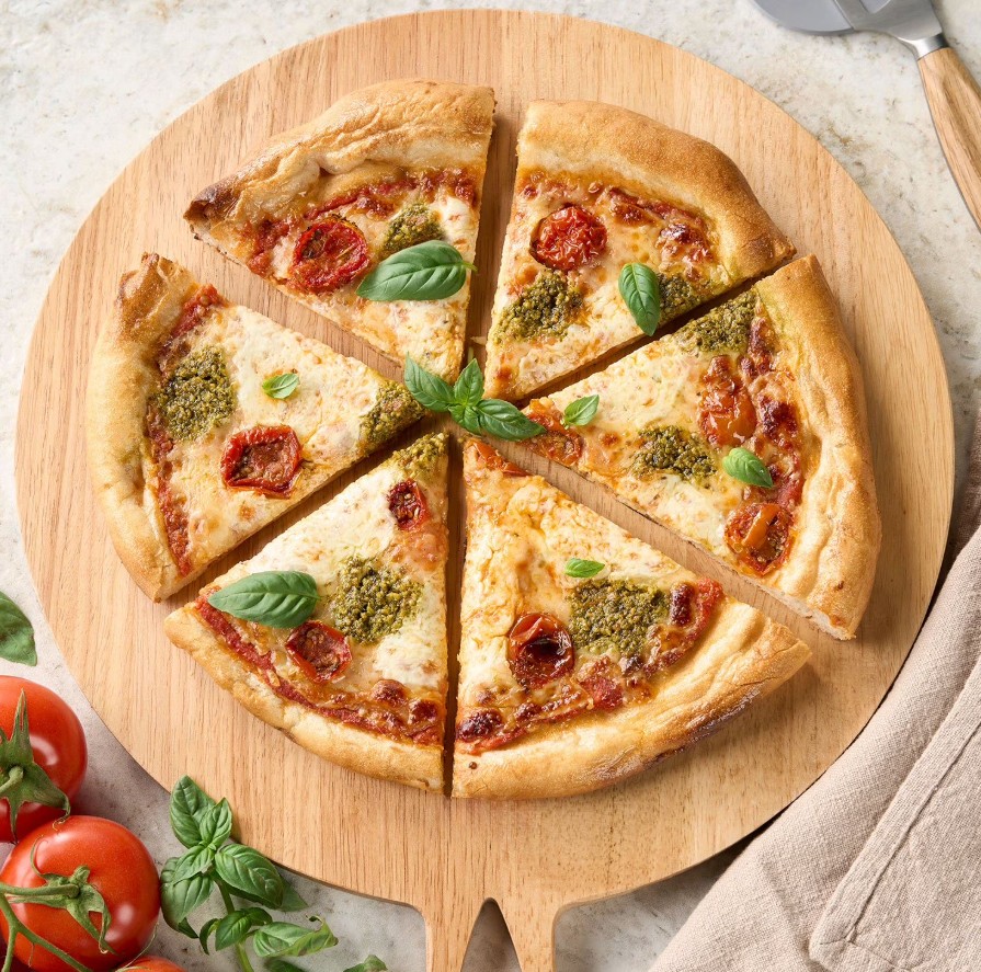 Taste Test: A surprise hit. Unlike many bland margarita pizzas, this one has a nice “greasy” richness (in a good way) and a brick-oven style char on the crust. The marinara is flavorful with Italian herbs, and the pesto dollops add a nice punch.