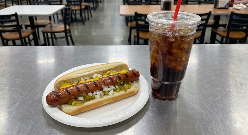 Description: A massive, smoked-sausage-sized beef frank paired with a generous 30oz fountain drink.